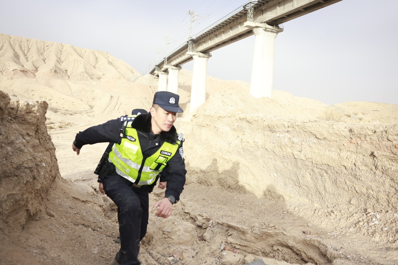 阿尔金山属喀斯特地貌,格库铁路在这里穿越的隧道多且长。有些区段,民警们只能在汽车“力所能及”的地方下车后徒步巡查。高原走路本就费劲,有时还要沿着铁路翻越山梁。民警们说,那种感觉就好像“肺都要炸开了”。